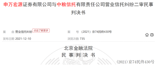 近日,裁判文书网公布了申万宏源证券有限公司(下称“申万宏源”)与中粮信托有限责任公司(下称“中粮信托”)营业信托纠纷的二审民事判决结果。