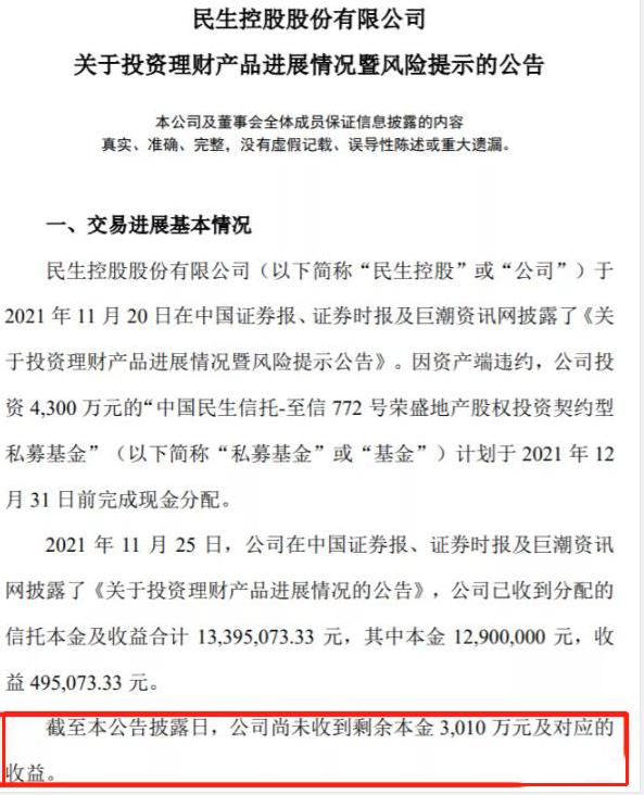 民生控股披露:原定于12月31日前完成现金分配的“中国民生信托-至信772号荣盛地产”,截止2022年1月12日,目前民生控股尚未收到剩余本金3010万元对应的收益。