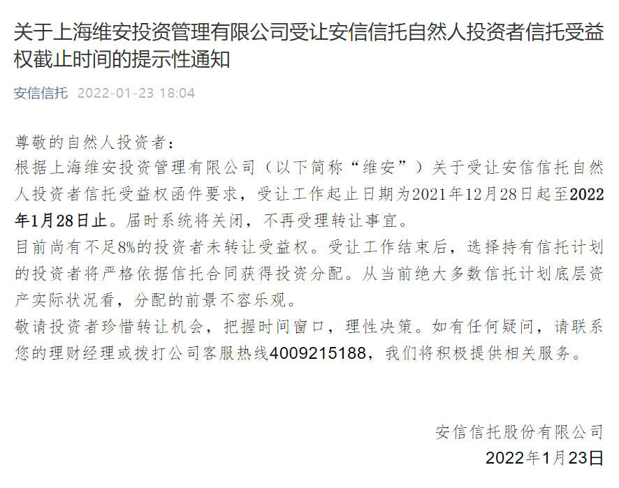 1月23日晚间,安信财富微信公众号发布《关于上海维安投资管理有限公司受让安信信托自然人投资者信托受益权截止时间的提示性通知》,该《通知》称: