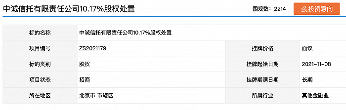 2021年11月,山东产权交易所上架中诚信托10.17%股权处置。招商方为山东能源集团有限公司(下称“山东能源集团”)。山东能源集团即兖矿集团,在2021年3月更名。山东产权交易所显示,在2016年10月,兖矿集团就曾将该所持10.1764%的股权挂牌转让,当时3.3921%股权的挂牌价格为6.3亿元。