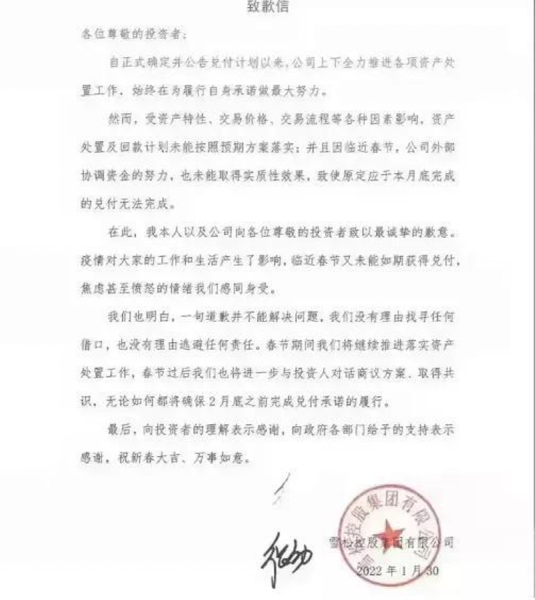 1月30日,也就是除夕前一天,雪松控股发了一封致歉信,告知投资者,因为资产特性、交易价格、交易流程等各种因素影响,资产处置及回款计划未能按照预期方案落实;并且因临近春节,公司外部协调资金的努力,也未能取得实质性效果,致使原定应于1月底完成的兑付无法完成。