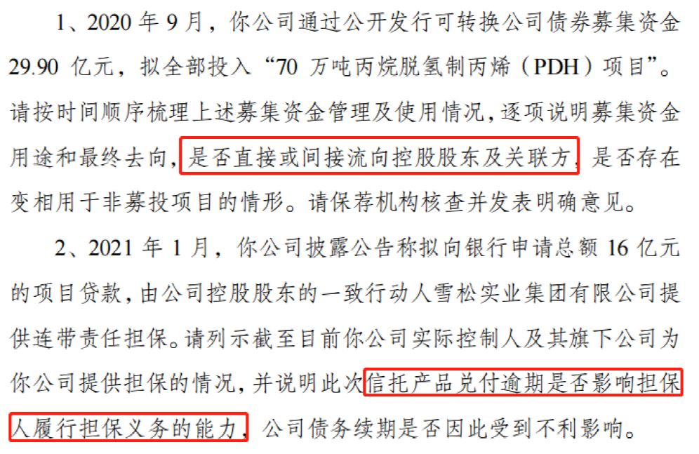 对齐翔腾达,深交所关注公司29.9亿元的可转债募集资金使用情况,要求说明资金用途和最终去向,是否直接或间接流向控股股东及关联方。公司16亿元的银行贷款续期由公司控股股东的一致行动人雪松实业集团提供连带责任担保,深交所关注会否因信托产品兑付逾期受到不利影响。