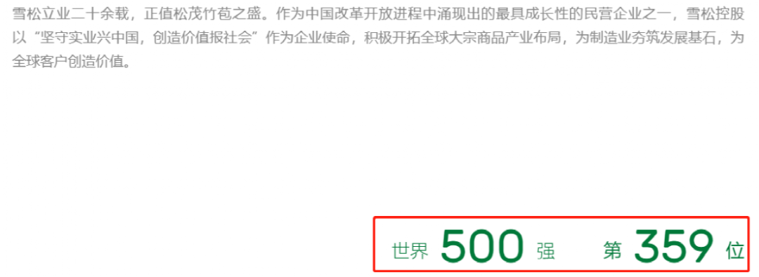 据公司官网,“雪松控股创立于1997年,全球总部位于广州,是广州本土成长起来的世界500强企业、中国大宗商品领军企业,以2334亿元营收位列2021年《财富》世界500强第359位,连续4年上榜”。