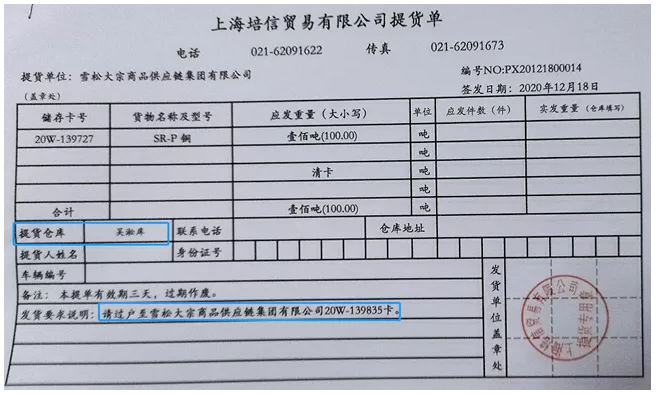 比如,上海培信贸易2020年12月18日出具的一份提货单显示,将该公司在吴淞库储存卡号为“20W-139727”的100吨SR-P铜,过户至雪松大宗商品供应链集团“20W-139835”储存卡(图13)。