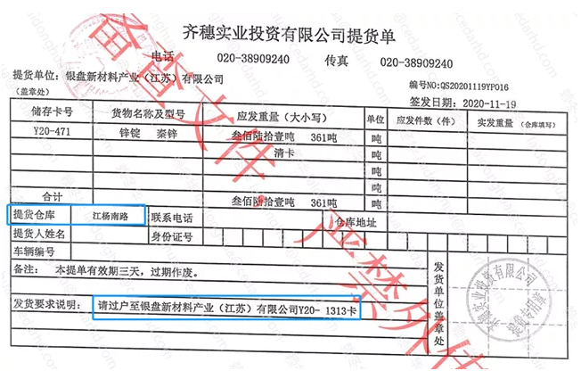 再比如,齐穗实业2020年11月19日出具的一份提货单显示,将该公司在江杨南路仓库储存卡号为“Y20-471”的361吨锌锭,过户至银盘新材料“Y20-1313”储存卡(图14)。