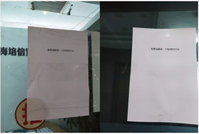 不过,两家公司的玻璃门上都各自新贴了一张纸,内容完全相同:“有事请联系:17825842710”(图6)。