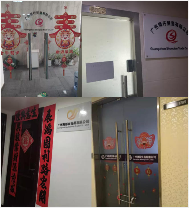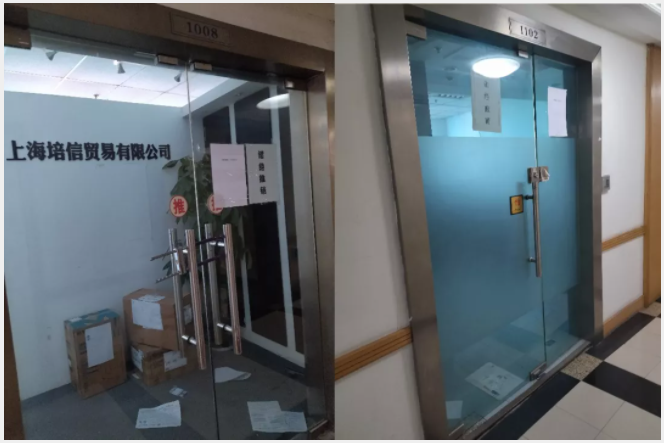 前述注册于上海及广州的贸易公司,记者及投资人于2022年2月14-15日再次逐一走访,依然是大门紧锁,人去楼空。