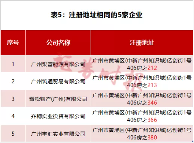 齐穗实业的注册地址为“广州市黄埔区(中新广州知识城)亿创街1号406房之366”,记者注意到,包含齐穗实业在内,相关理财产品涉及的企业中,有5家公司注册于此(表5)。其中,前三家——柴富能源、筑通贸易、雪松物产,皆为雪松控股下属公司。