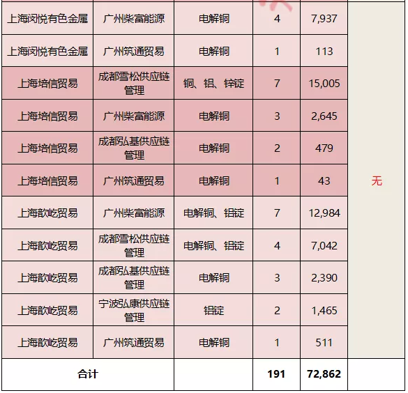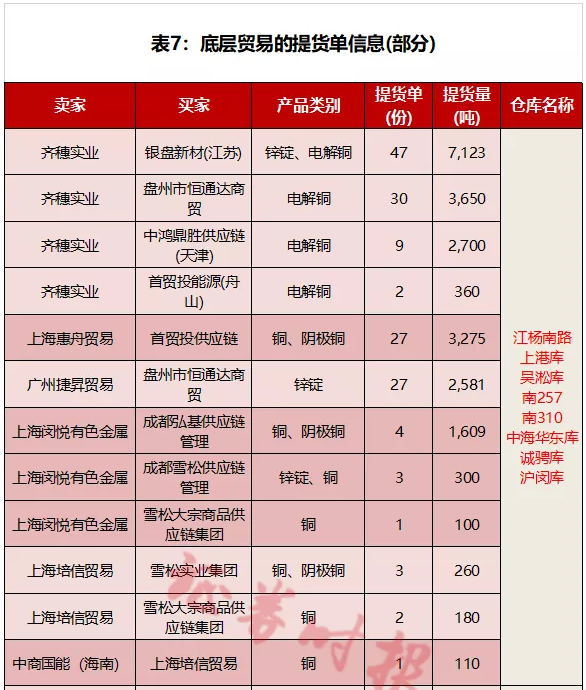 记者对底层贸易资料中的提货单信息进行了统计,提货单数量共计191份,涉及上游卖家7家、下游买家11家,所交易的铜、铝、锌等大宗商品共计7.29万吨(表7)。