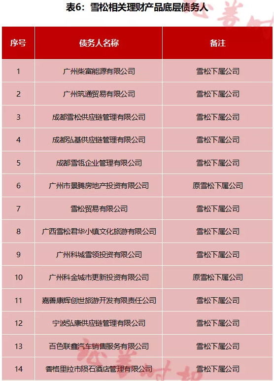 正是这些雪松体系内的公司与体外的众多假国企,成为了351只理财产品、至少200亿元规模底层资产的债务人。如今,理财产品全面逾期,既不见融资人还款,也不见债务人回款。