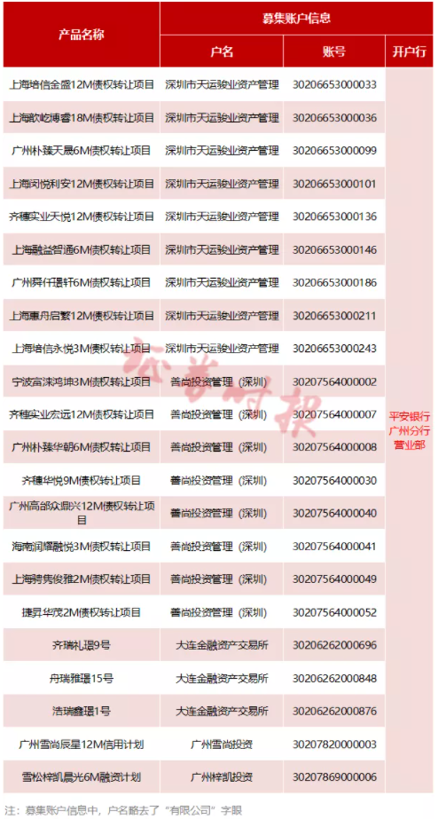 另一个可供佐证的信息是,天运骏业及善尚投资虽然注册于深圳,但其资金募集账户清一色开设在平安银行广州分行营业部(表3)。雪松旗下大连金交所相关产品的募集账户,以及数家子公司的募集账户,同样开设于此。广州正是雪松控股总部所在地。