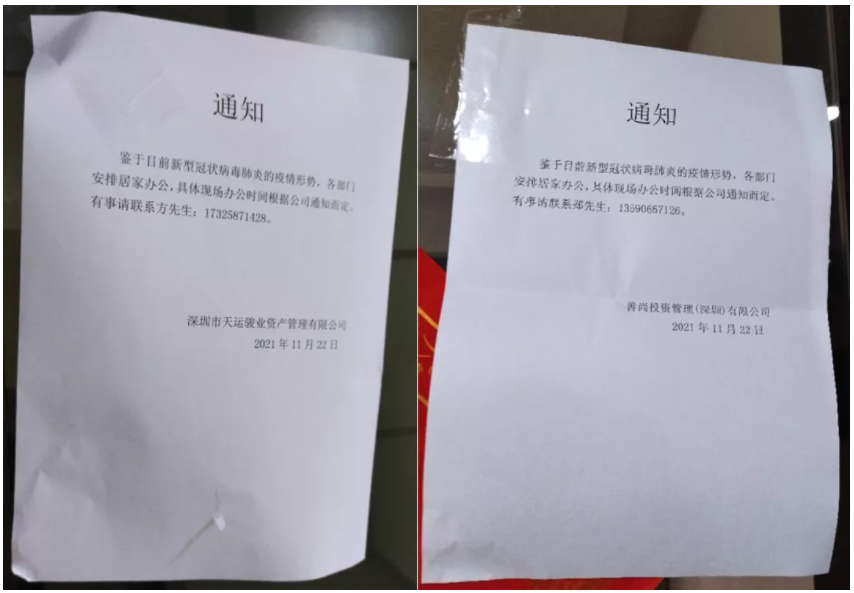 两家公司的大门玻璃上,分别贴了一张通知,上面写着完全一致的内容:鉴于目前新型冠状病毒肺炎的疫情形势,各部门安排居家办公,具体现场办公时间根据公司通知而定。落款时间同为2021年11月22日(图3)。记者看到,两家公司的左右邻居都在正常办公,其时,深圳也未出现疫情。