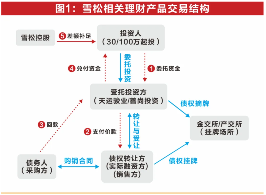 换句话说,受托投资方实际上是资金募集方,募得资金之后再支付给资产转让方(实际融资方),以完成应收账款的受让。未来向投资人兑付的资金,则来自底层债务人的回款,而雪松控股对产品的兑付做了兜底承诺(出具差额补足承诺函)。
