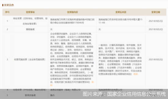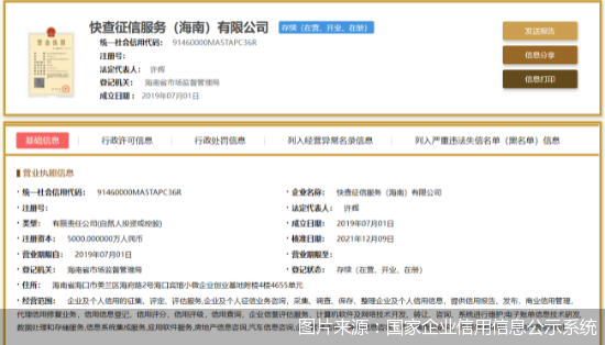 速查征信全称为速查征信服务(海南)有限公司,在2021年8月被曝光后,该公司迅速将名称变更为海南速查查科技有限公司(以下简称“速查查”),同时,工商信息中经营范围也删除了“企业及个人信用的征集、评定、评估服务,企业及个人信用信息服务、企业及个人征信业务、信用调查,采集、调查、保存、整理、提供企业及个人信用信息、信用信息登记,信用查询,信用咨询、信用信息记录(报告)、发布,信用评分、信用评估,信用评级,商业信用管理,代理信用修复业务”等措辞。