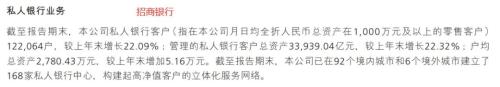 作为目前国内私行的头把交椅,唯一的3万亿私行。招行财报显示,私人银行客户122064户,较上年末增长22.09%;管理的私人银行客户总资产33939.04亿元,较上年末增长22.32%;户均总资产2780.43万元,较上年末增加5.16万元。
