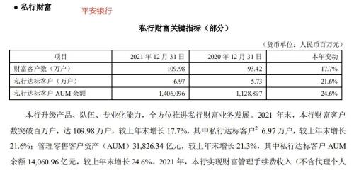 另一家这几年快速崛起的私行是平安银行。平安银行表示,本行升级产品、队伍、专业化能力,全方位推进私行财富业务发展。2021 年末,私行达标客户6.97 万户,较上年末增长21.6%;私行达标客户资产余额 14,060.96 亿元,较上年末增长 24.6%。
