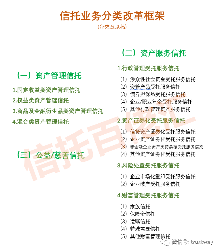 按照《信托业务分类征求意见稿》,信托公司应对各项存续业务进行全面梳理,制定存量业务整改计划。对于基于信托关系开展的私募基金管理等业务,按照严禁新增、存量自然到期方式有序清零。对于其他不符合分类要求的信托业务,在资产管理信托项下单设待整改信托业务一类,将相关业务归入此类别,按照业务特点有序实施整改。