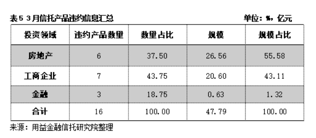 用益金融信托研究院数据显示,3月份房地产领域违约信托产品规模为26.56亿元,占比55.58%;工商企业类信托产品违约规模为20.60亿元,占比43.11%。