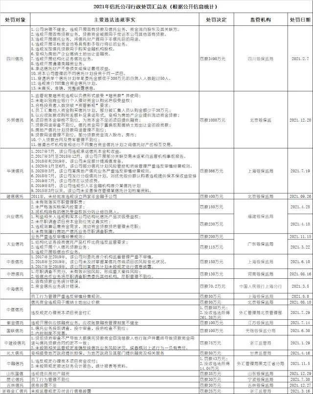 信托的处罚主要是各地银保监会,随着信托业务范围不断扩大,监管的维度也在不断加大,2021年就有两家信托机构被外汇管理局处罚,中融信托违法被罚募资投放到“四证不全”房地产项目,未按照规定报送财务会计报告、统计报表等资料被罚款43万元;且没收违法所得,7月时,外汇管理局北京管理部就因中信信托违反规定办理资本项目资金付汇,被处罚金58万元。