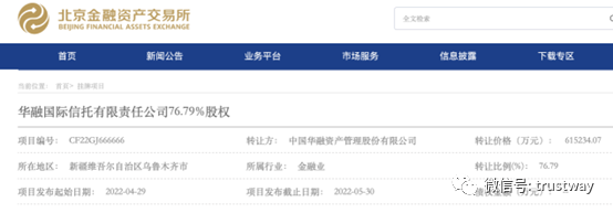 近日,华融信托76.79%股权在北京金融资产交易所(北金所)挂牌转让,转让方为中国华融资产管理股份有限公司(中国华融,2799.HK),转让价格为61.52亿元。该项目发布截止日期为5月30日。