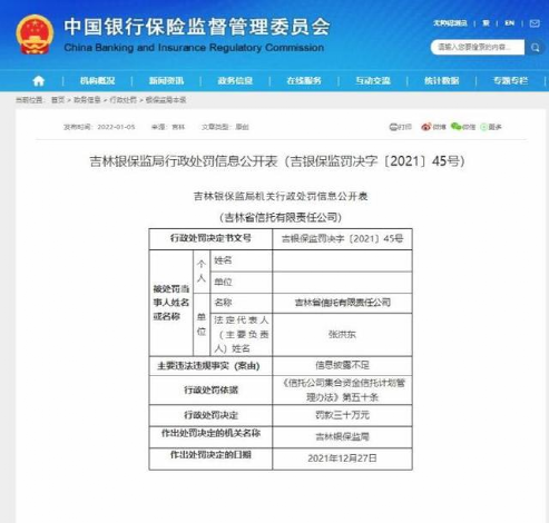 今年1月,吉林银保监局公开行政处罚信息,对吉林信托处罚30万元,违法违规事由是信息披露不足。李某、于某两人因对吉林信托信息披露不足负直接责任,给予警告处罚。