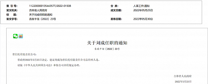5月30日,吉林省人民政府发布通知,省政府2022年5月25日决定,免去刘成的省吉盛资产管理有限责任公司(简称“吉盛公司”)副总经理职务,建议刘成为省信托有限责任公司总经理人选。
