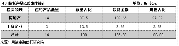 根据用益金融信托研究院统计,2022年4月发生信托产品违约事件16起,涉及金额136.32亿元。4月信托风险事件主要集中在房地产和工商企业两大领域。