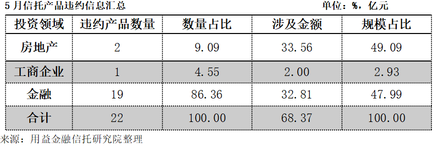 据公开资料不完全统计,2021年5月共发生信托产品违约事件22起,涉及金额68.37亿元。
