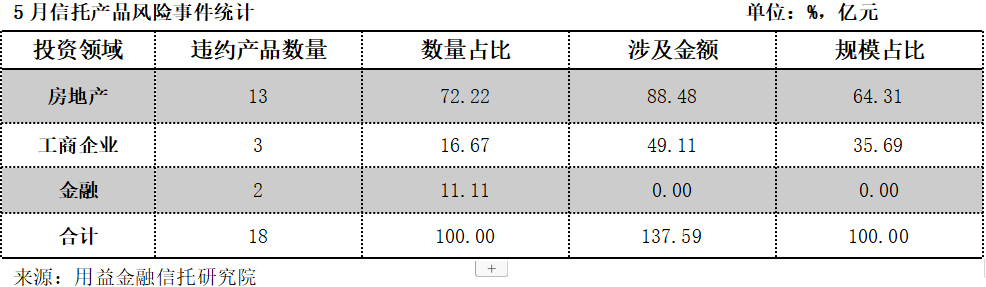 据公开资料不完全统计,截至6月6日,2022年5月共发生信托产品违约事件18起,涉及金额137.59亿元。