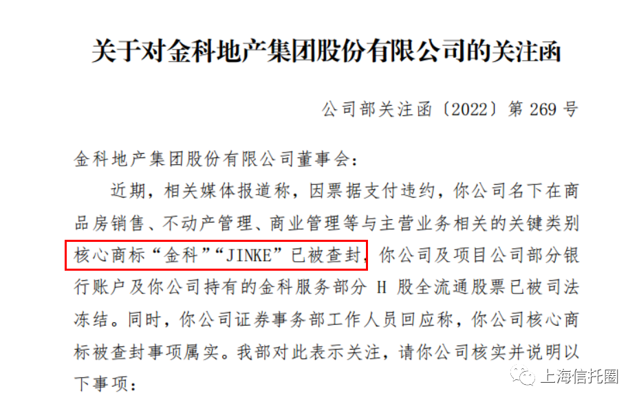 不仅银行账户和公司持有的金科服务的股票已被司法冻结,甚至因票据违约,其核心商标“金科”、“JINKE”都被查封了。