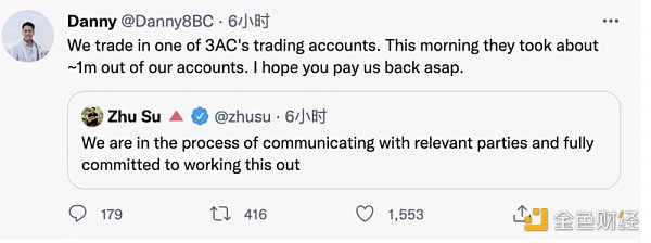 在 Zhu Su 发表完‘正解决问题’的推特后,推特用户 @Danny8BC 便表示其在三箭资本交易账户中的 100 万美元被提取,并要求三箭资本尽快归还。
