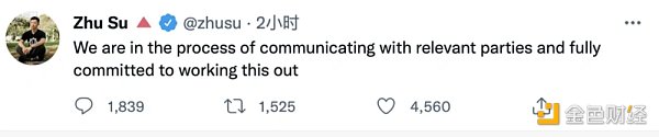 今天三箭资本创始人 Zhu Su 的一则推特让加密社区再一次炸了锅,‘我们正在与有关方面进行沟通,并致力于将问题解决。’