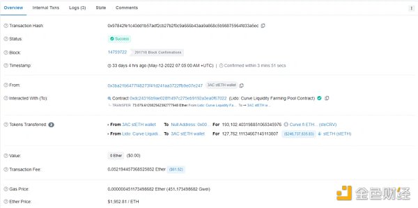 同时,三箭资本还在抛售 stETH 。在 stETH‘脱钩’至 0.94 ETH 时,三箭资本从 Curve 中抽出了 12.7 万枚 stETH 的流动性(当时价值 2.46 亿美元)。