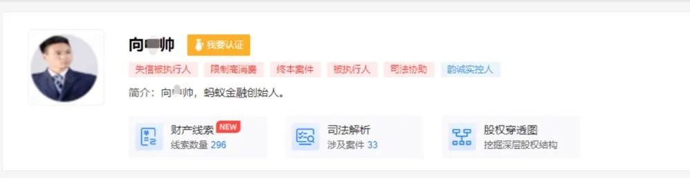 层层穿透来看,上述企业实控人均为向某帅,其简介显示为“蚂蚁金融创始人”。