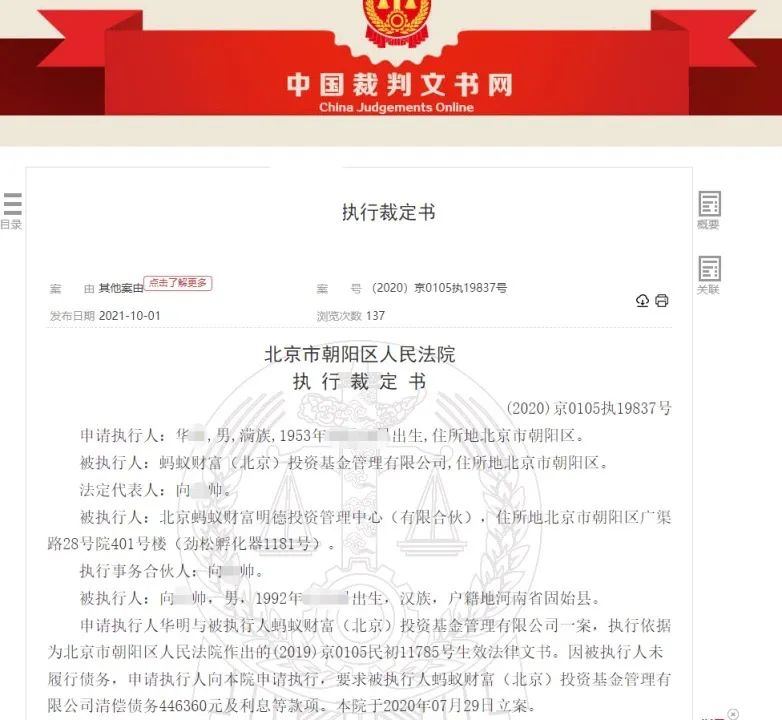 例如,投资者华某在胜诉后向朝阳区法院申请执行,被申请人为蚂蚁财富公司、蚂蚁财富中心二公司及向某帅。执行裁定书显示,法院依法向被执行人发出执行通知书、报告财产令,并依法传唤了被执行人。