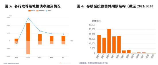 债券期限方面,3年期债券发行规模占比提升,推升2024年债券偿付规模,截至2022年1月10日,2024年内到期偿付债券规模已近2.6万亿元高峰。