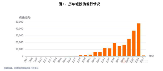 根据中债资信城投口径统计,2021年城投债总发行量达4.8万亿元,同比增长29%,发行规模继2020年后又创新高,但增速同比有所放缓;受大规模债券到期影响,2021年城投债净融资额近三年来首次同比小幅回落,保持1.54万亿左右水平。2021年9月,存量城投债金额已突破十万亿大关,截至2021年12月31日,存续城投债规模达10.6万亿元,在信用债中占比达43%。