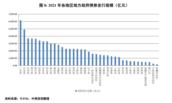 2021年全国31个省级(直辖市)政府、5个计划单列市政府及新疆生产建设兵团共计发行含中小银行专项债券在内的地方政府债券7.48万亿元,较2020年6.44万亿元大幅增长16.12%。从各地区地方政府债券的实际发行规模来看,2021年共有包括广东、山东、江苏、四川、浙江等在内的9个省、市地方债发行规模超过3,000亿元,其中,广东实际发行的地方债规模更是超过6,000亿元,位居各发债主体之首。而新疆生产建设兵团、厦门、宁夏以及西藏地区实际发行的地方债规模尚不足500亿元,其中,西藏则是以162.31亿元的规模位居全国发行规模末尾。