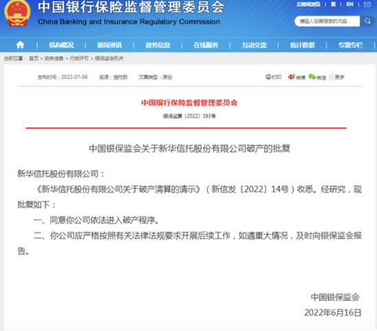 7月6日,银保监会官宣对新华信托破产清算的请示作出批复,同意公司依法进入破产程序。