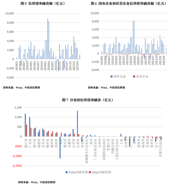 债券市场角度,二季度,受季节性因素及城投债融资监管趋严影响,信用债发行规模回落,发行总量2.80万亿元,净融资额为3,231.27亿元,相比去年同期微增。从企业结构来看,二季度债券市场融资仍以国有企业占据绝对主导,净融资规模为3,899.10亿元,民营企业信用债净融资额为-405.28亿元,净融资规模持续为负,但较2021年同期明显改善;从分省份净融资规模来看,浙江、广东、福建等东部地区持续净流入,但同比规模显著回落,山西省相较去年同期净融资规模回升明显,而东北三省、内蒙、甘肃等省份净融资规模多为负值,区域分化依然显著;从行业结构来看,城投、化工、房地产、综合等行业净融资规模靠前,而采掘、食品饮料、公用事业等行业净融资规模为负,房地产行业信用债净融资约400亿元,但非国有企业发行规模不足50亿元,主要发行主体包括万科、碧桂园、龙湖,到期规模超过150亿元,其中约65亿元已发生展期或违约。