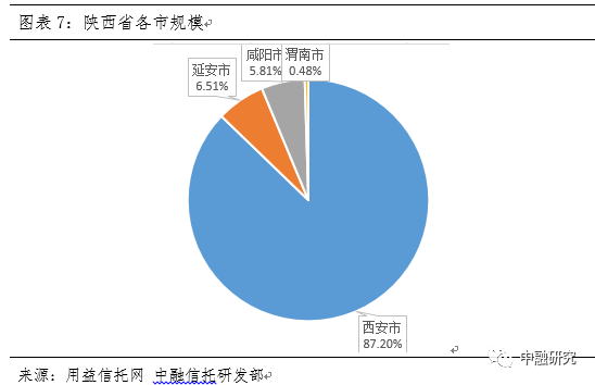 陕西省基础产业类业务开展城市相对集中,根据不完全统计显示,目前集中在西安市、延安市、咸阳市和渭南市。其中省会西安市是占据绝大部分规模,达到168.5亿元,占比超过87%;延安市和咸阳市发行规模为12.6亿元和11.2亿元,占比分别为6.5%和5.8%。