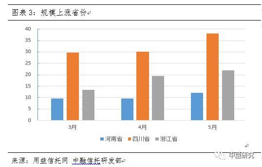 从逐月开展的规模来看,四川省、浙江省以及河南省近3个月规模呈现逐月增长态势,信托公司业务较多。其中浙江省3至5月规模依次为13.3亿、19.5亿和19.5亿;四川省最近3个月规模为29.8亿元、30.1亿以及38.1亿;河南省3到5月间发行规模则为9.6亿、9.6亿以及12.2亿。