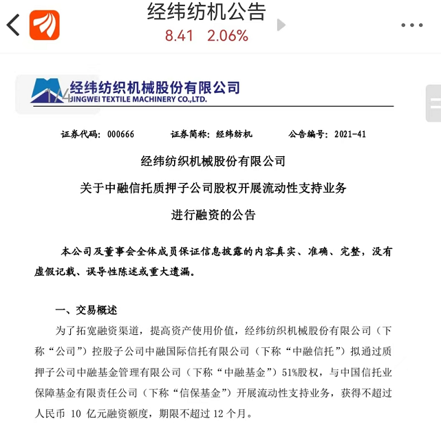 2021年8月,经纬纺机发布公告称,为了拓宽融资渠道,提高资产使用价值,中融信托拟通过质押中融基金51%股权,与中国信托业保障基金有限责任公司(以下简称“信保基金”)开展流动性支持业务,获得不超过人民币10亿元融资额度,期限不超过12个月。