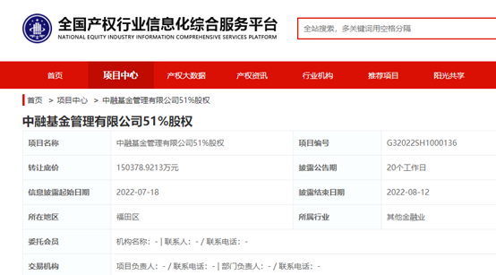 7月18日,来自全国产权行业信息化综合服务平台发布的信息显示,中融信托以底价约15.04亿元的价格公开挂牌转让所持有的中融基金管理有限公司(以下简称“中融基金”)全部51%股权。