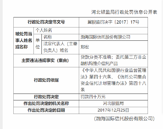 6月27日消息,河北银监局行政处罚信息公开表显示,渤海国际信托因存在贷款分类不准确;委托第三方非金融机构推介信托产品的违法违规事实,被河北银监局罚款40万元。uXt财经新闻网