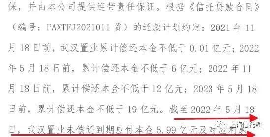 2021年11月18日前,武汉置业累计偿还本金不低于0.01亿元;2022年5月18日前,累计偿还本金不低千6亿元:2022年11月18日前,累计偿还本金不低于12亿元;2023年5月18日前,累计偿还本金不低于19亿元。