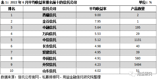 从信托公司来看,纳入了6月份收益率进行统计的产品共来自43家信托公司,其中产品数量最多的为外贸信托,共5494只,占比高达55.01%,其次中信信托和华润信托,分别为1131只和580只。产品数量在百只以上的还有五矿信托、建信信托、兴业信托、中融信托、平安信托、交银信托、华宝信托和财信信托。