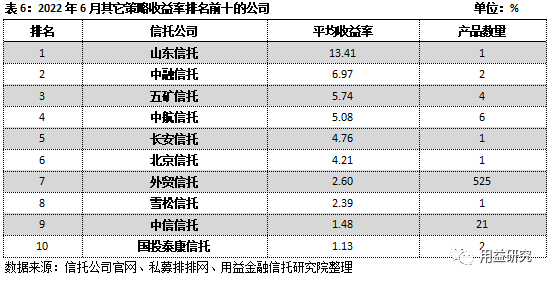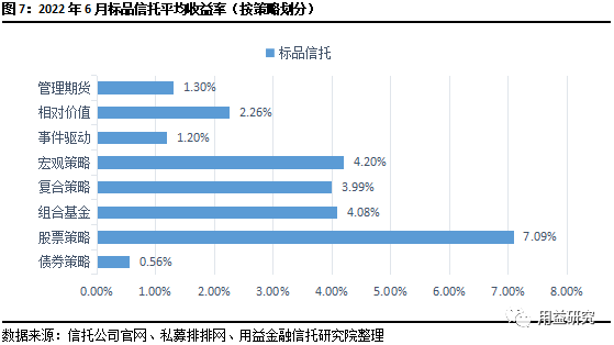 值得一提的是,股票策略收益率最高的产品为由云南信托发行的“融湖精选(中国龙精选)资本市场集合资金信托计划”,其6月收益率高达36.52%。但由于云南信托旗下产品收益断层较为明显,大部分产品收益均在5%以下,导致云南信托未能上榜。