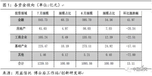 从今年前7个月的整体规模来看,政信类业务规模或已经触摸到了一个天花板,难以再有大的突破。7月基础产业类信托成立规模225.47亿元,较6月273.11亿元的表现,环比下滑17.44%,规模占比也降至20%以下,仅有18.19%。