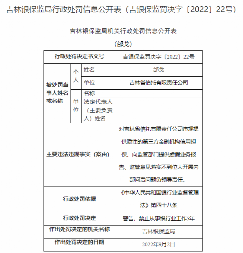 具体到责任人上,吉林信托共有7名相关责任人被罚。其中,吉林信托时任总经理、党委书记、董事长邰戈因对前述吉林信托全部违法违规事实负领导责任,被吉林银保监局处以警告,并禁止从事银行业工作5年。